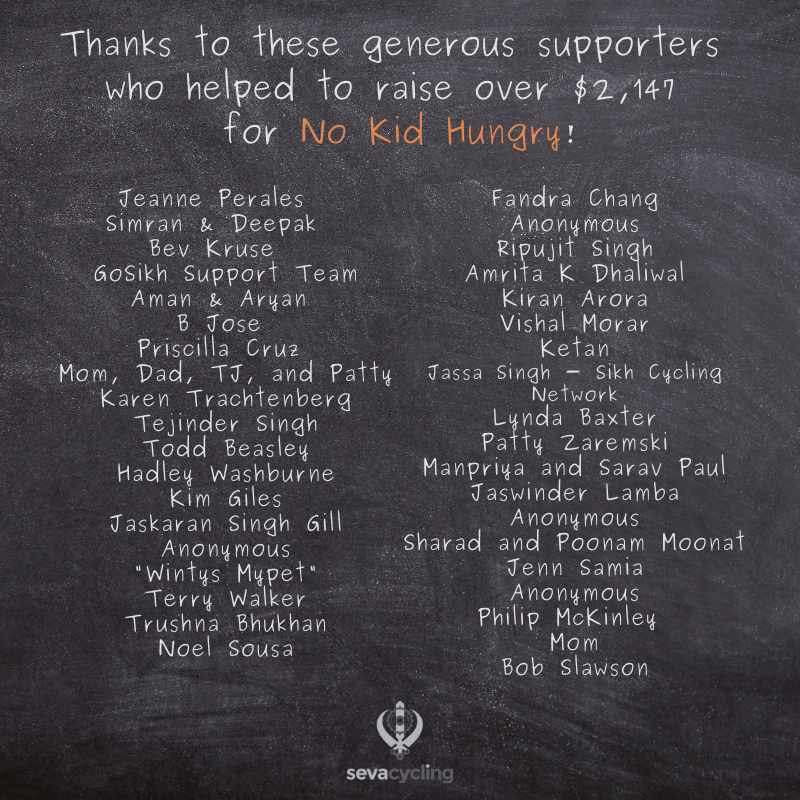 At the end of my ride, 39 people donated a total of $2,182.99 for No Kid Hungry (over twice my goal!). I cannot thank enough everyone who supported me in this cause. I’m moved to think about the potential that this generosity will have to help hungry children across our country.