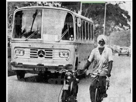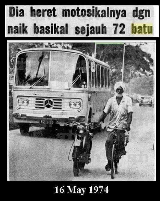 From the online newspaper Asia Samachar comes this photo taken in 1974 of one Narajan Singh. At 69 years old, he rode 74 miles from Malaysia to Singapore on a borrowed bike while hand-towing his broken-down motorcycle which he didn’t want to abandon on his business trip. Before the emergence of MAMILs, he clearly didn’t do this to feel like a hero. He was doing what he had to to get through life.